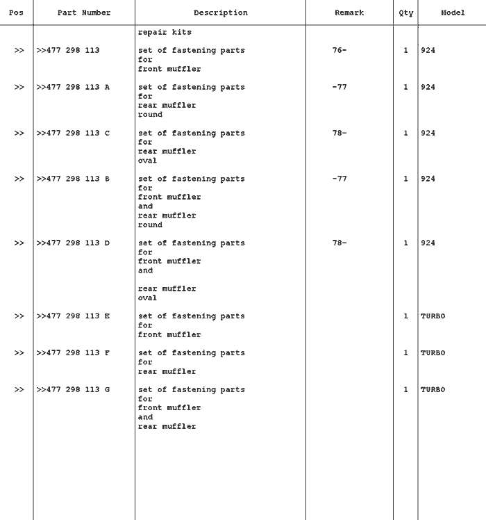 | Pos | __Part_Number__ | Description | Remark | Qty. | Model | | | | repair kits | | | | | >> | 477 298 113 | set of fastening parts for | 76 | 1 | 924 | | | | front muffler | | | | | >> | 477 298 113 A | set of fastening parts for rear muffler | -77 | 1 | 924 | | | | round | | | | | >> | 477 298 113 C | set of fastening parts for | 78 | 1 | 924 | | | | rear muffler | | | | | | | oval | | | | | >> | 477 298 113 B | set of fastening parts for front muffler | -77 | 1 | 924 | | | | and | | | | | | | rear muffler | | | | | | | round | | | | | >> | 477 298 113 D | set of fastening parts for front muffler | 78 | 1 | 924 | | | | and | | | | | | | rear muffler | | | | | | | oval | | | | | >> | 477 298 113 E | set of fastening parts for | | 1 | TURBO | | | | front muffler | | | | | >> | 477 298 113 F | set of fastening parts for | | 1 | TURBO | | | | rear muffler | | | | | >> | 477 298 113 G | set of fastening parts for front muffler | | 1 | TURBO | | | | and | | | | | | | rear muffler | | | |