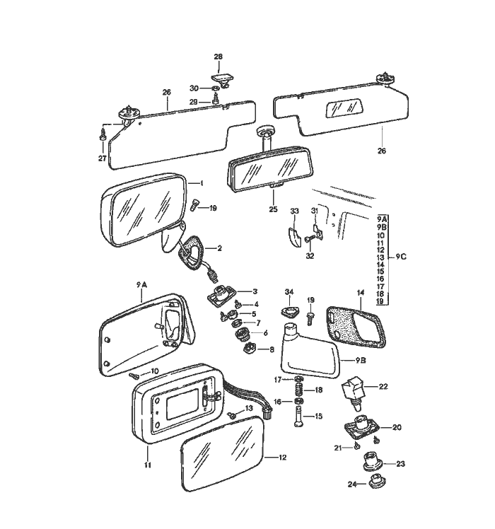 | Pos | __Part_Number__ | Description | Remark | Qty. | Model | | 23 | 928 555 463 02 | threaded bush | | 1 | | | 24 | 928 613 462 00 | knob | | 1 | | | | | electrical components for door mirror | | 1 | | | - | 477 971 111 | wiring harness door mirror driver's door | | 1 | | | - | 477 971 115 A | wiring harness door mirror dashboard | Left Hand Drive | 1 | | | - | 477 971 910 | bellows | | 1 | | | | | see group 8/04/00 | | | | | | | electrical components for door mirror | | 2 | | | - | 477 971 115 | wiring harness door mirror dashboard | Left Hand Drive | 1 | | | - | 477 971 113 | wiring harness door mirror passenger's door | | 1 | | | - | 477 955 703 | rocker switch passenger's side | Left Hand Drive | 1 | | | - | 803 971 979 | plug socket 7-pole | | X | | | - | 477 971 910 | bellows | | 2 | | | | | see group 8/04/00 | | | | | - | * 477 898 025 | installation set | Left Hand Drive \/ Left Side | 1 | | | - | * 477 898 026 | installation set electric adjustable and heatable door mirror plane | Left Hand Drive \/ Right Side | 1 | | | 25 | 477 857 511 A | interior mirror | | 1 | | | | 01C | black | | | |