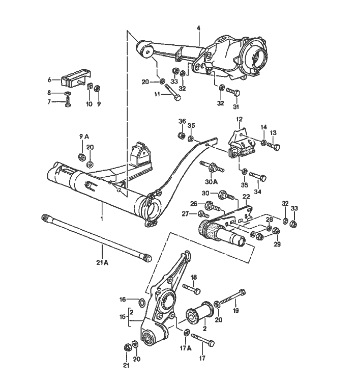| Pos | __Part_Number__ | Description | Remark | Qty. | Model | | 13 | 900 075 040 02 | hexagon-head bolt | | | 2 | | | | | M 10 X 20 | | | | | | 14 | N 012 230 6 | spring washer | | | 8 | | | | | B 10 | | | | | | 15 | A 944 331 059 00 | bearing flange | Left | | 1 | | | 15 | 944 331 059 00 | bearing flange | Left | | 1 | | | (15) | A 944 331 060 00 | bearing flange | Right | | 1 | | | (15) | 944 331 060 00 | bearing flange | Right | | 1 | | | 16 | 951 331 667 00 | washer | | | 2 | | | 17 | N 010 465 5 | hexagon-head bolt | | | 2 | | | | | M 10 X 65 | | | | | | 17A | N 012 230 6 | spring washer | | | 8 | | | | | B 10 | | | | | | 18 | N 010 455 3 | Schraube | | | 6 | | | | | M 10 X 55 | | | | | | 19 | 900 082 059 02 | hexagon-head bolt | | | 2 | | | | | M 12 X 1,5 X 115 | | | | | | 20 | 803 199 347 | washer | | | 8 | | | 21 | N 022 141 4 | lock nut | | | 2 | | | | | VM 12 X 1,5 | | | | | | (21A) | 944 333 115 00 | torsion bar | Left | | 1 | | | | | $ 23,5 MM | | | | | | (21A) | 944 333 116 00 | torsion bar | Right | | 1 | | | | | $ 23,5 MM | | | | | | (21A) | 944 333 103 00 | torsion bar | Left | -86 | 1 | 944,M 030 | | | | $ 24,5 MM | | | | | | (21A) | 944 333 104 00 | torsion bar | Right | -86 | 1 | 944,M 030 | | | | $ 24,5 MM | | | | | | (21A) | 951 333 103 30 | torsion bar | Left | | 1 | M 030/758 | | | | $ 25,5 MM | | | | | | (21A) | 951 333 104 30 | torsion bar | Right | | 1 | M 030/758 | | | | $ 25,5 MM | | | | | | 22 | 951 333 021 00 | rear axle strut | | | 2 | |