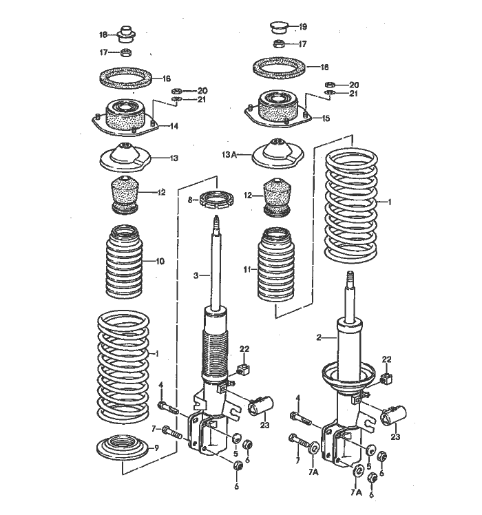 | Pos | __Part_Number__ | Description | Remark | Qty. | Model | | 1 | 951 343 531 03 | coil spring 1 set identification | | 90 | 1 | TURBO | | | 904 | grey | | | | | | 2 | 951 343 031 05 | shock absorber -fichtel + sachs -F >>94KN4 51002 | Left | -89 | 1 | 944 | | (2) | 951 343 032 05 | shock absorber -fichtel + sachs -F >>94KN4 51002 | Right | -89 | 1 | 944 | | 2 | 944 343 031 17 | shock absorber -fichtel + sachs -F 94KN4 51002>> | Left | -89 | 1 | 944 | | (2) | 944 343 032 17 | shock absorber -fichtel + sachs -F 94KN4 51003>> | Right | -89 | 1 | 944 | | 2 | 944 343 031 19 | shock absorber -fichtel + sachs - | Left | | 1 | 944S2 | | (2) | 944 343 032 19 | shock absorber -fichtel + sachs - | Right | | 1 | 944S2 | | 2 | 951 343 031 12 | shock absorber -fichtel + sachs - | /L /L | 9090 | 1 | 944S2,M 031 TURBO | | (2) | 951 343 032 12 | shock absorber -fichtel + sachs - | /R /R | 9090 | 1 | 944S2,M 031 TURBO | | 2 | 951 343 031 06 | shock absorber -koni - | Left | -89 | 1 | 944,M 474 | | (2) | 951 343 032 06 | shock absorber -koni - | Right | -89 | 1 | 944,M 474 | | 2 | 951 343 031 11 | shock absorber -koni - | Left | -89 | 1 | 944S2,M 474 | | (2) | 951 343 032 11 | shock absorber -koni - | Right | -89 | 1 | 944S2,M 474 | | 3 | 951 343 031 32 | vibration damper -koni - | /L /L /L /L | -89 -89 90 | 1 | 944,M 030 944S2,M 030 TURBO,M 030 TURBO, |