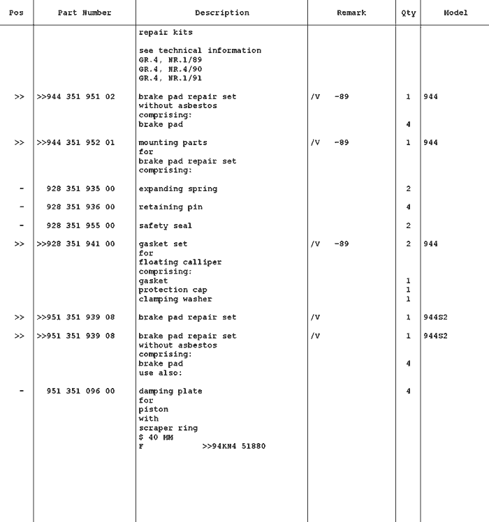 | | | repair kits | | | | | | | | see technical information | | | | | | | | GR.4, NR.1/89 GR.4, NR.4/90 GR.4, NR.1/91 | | | | | | >> | 944 351 951 02 | brake pad repair set without asbestos | Vorder | -89 | 1 | 944 | | | | comprising: brake pad | | | 4 | | | >> | 944 351 952 01 | mounting parts for | Vorder | -89 | 1 | 944 | | | | brake pad repair set comprising: | | | | | | - | 928 351 935 00 | expanding spring | | | 2 | | | - | 928 351 936 00 | retaining pin | | | 4 | | | - | 928 351 955 00 | safety seal | | | 2 | | | >> | 928 351 941 00 | gasket set for floating calliper comprising: gasket protection cap clamping washer | Vorder | -89 | 2 1 1 1 | 944 | | >> | 951 351 939 08 | brake pad repair set | Vorder | | 1 | 944S2 | | >> | 951 351 939 08 | brake pad repair set without asbestos comprising: brake pad use also: | Vorder | | 1 4 | 944S2 | | - | 951 351 096 00 | damping plate for piston with | | | 4 | | | | | scraper ring $ 40 MM F >>94KN4 51880 | | | | |