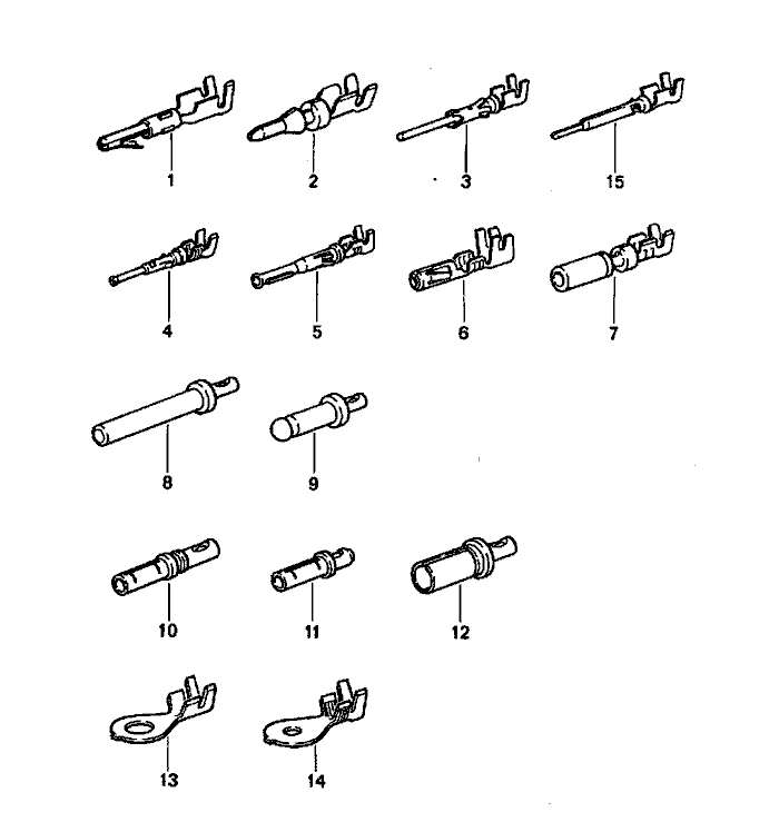 | | | round connector | | | | | | | contact pin | | | | | | | cable shoe | | | | | 1 | N 017 586 2 | round connector | | X | | | | | $ 0,5 -1,0 CUZN | | | | | 2 | 944 612 428 00 | round connector | | X | | | | | $ 0,75 -1,5 CUSN | | | | | 3 | N 017 564 1 | round connector | | X | | | | | $ 0,5 -1,0 CUSN | | | | | 4 | N 017 562 4 | cylindrical socket | | X | | | | | $ 0,5 -1,0 CUSN | | | | | 6 | N 017 599 4 | cylindrical socket | | X | | | | | $ 2,5 -6,0 CUSN | | | | | 7 | 944 612 427 00 | contact bush | | X | | | | | $ 0,75 -1,5 CUSN | | | | | 8 | 999 652 369 12 | pin | | X | | | | | $ 0,5 -2,0 CUAG | | | | | 9 | 911 612 907 00 | contact pin | | X | | | | | $ 0,5 -2,0 CUAG | | | | | 9 | 944 612 546 00 | contact pin | | X | | | | | $ 0,5 -2,0 | | | | | 10 | 944 612 548 00 | contact bush | | X | | | | | $ 0,5 -2,0 CUAG | | | | | 11 | 999 652 351 22 | contact bush | | X | | | | | $ 0,5 -2,0 CUBE | | | | | 12 | 999 652 371 12 | bush | | X | | | | | $ 0,5 -2,0 CUAG | | | | | 13 | N 017 505 4 | cable shoe | | X | | | | | $ 5,0 -1,0 | | | | | (13) | N 017 515 4 | cable shoe | | X | | | | | $ 5,0 -2,5 | | | | | (13) | N 017 516 2 | cable shoe | | X | | | | | $ 6,0 -2,5 | | | | | (13) | N 017 518 2 | cable shoe | | X | | | | | $ 8,0 -2,5 CUSN | | | |
