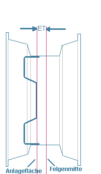 Die Einpresstiefe bezeichnet das Maß (in mm) von der Felgenmitte (zwischen den Felgenhörnern) bis zur inneren Anlagefläche (mit dem die Felge festgeschraubt wird) der Felge.